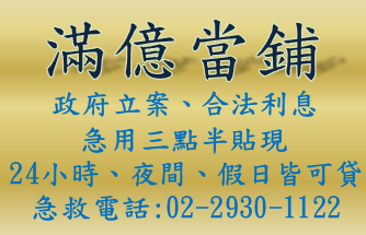 滿億當舖,汽車借錢免留車.機車借錢 免留車..中山區當舖.內湖區當舖.信義區當舖.南港區當舖.松山區當舖.大安區當舖.士林區當舖.大同區當舖.中正區當舖.萬華區當舖.文山區當舖.北投 區當舖.中和區當舖.永和區當舖.新北市當舖.汐止區當舖.基隆市當舖.借錢.借款.典當.週轉.轉當降息.免留車